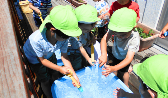 水遊び暑い夏はなんと言っても水遊び!園庭で子ども達は元気いっぱいに遊びます!